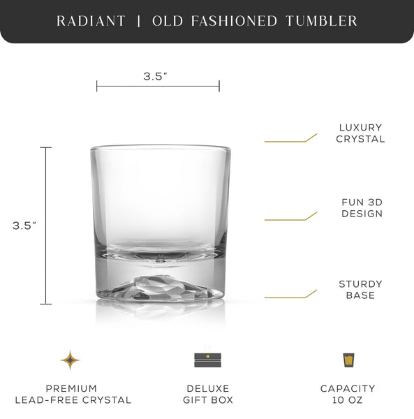 Look close at this Whiskey drinking glass and you’ll notice the base is a crystal mountain! Not only that, it’s magnified in the glass with your drink! And whether you love mountain air or not, this glass is full of altitude and a peak experience for outdoorsy types and whiskey lovers alike! • Elegant, Luxury Crystal Whiskey Glasses • Elegant Mountain (Solid Crystal) in the Base! • Set of 4 DOF Glasses (10oz) 100% Crystal Handwash Only. • 3.5” Wide, 3.5” Tall – Satisfying to Hold • 10oz Glass Heft with 1/8” Rim • Gift boxed with secure padding • 1-year Limited Manufacturer’s Warranty