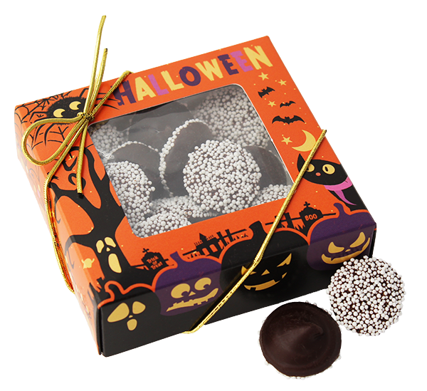 Each piece is the perfect size and richness to satisfy your chocolate craving! Available in milk and dark chocolate. Packaged in a decorative Halloween box (3 oz).